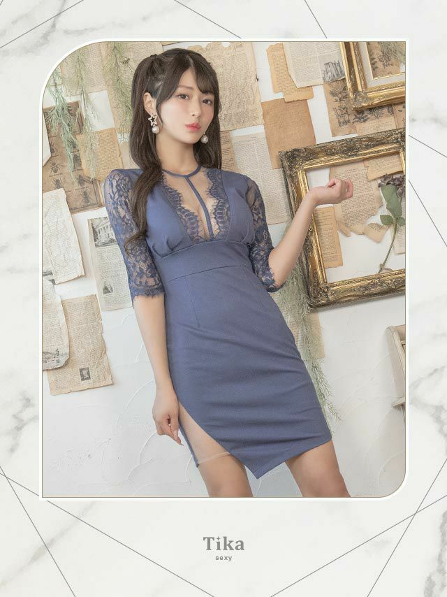 5. [アウトレット]袖あり 五部袖 バストシースルー レース切替 サイドヌーディー アシメ 谷間魅せ タイトミニドレス (Sサイズ~XLサイズ) (めぐりっぷ/キャバドレス着用)[Tika/ティカ]