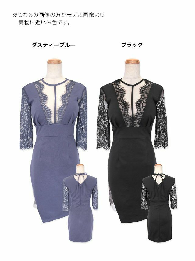 キャバドレス ミニ丈 キャバクラ クラブ ラウンジ 袖あり 五部袖 バストシースルー レース切替 サイドヌーディー アシメ 谷間魅せ タイトミニドレス