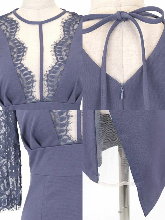 袖あり五部袖バストシースルーレース切替サイドヌーディーアシメ谷間魅せタイトミニドレスの商品画像4枚目