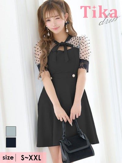 5. シアードット半袖ネックリボンフレアミニドレス (Sサイズ~XXLサイズ) (聖菜/キャバドレス着用) [Tika/ティカ]