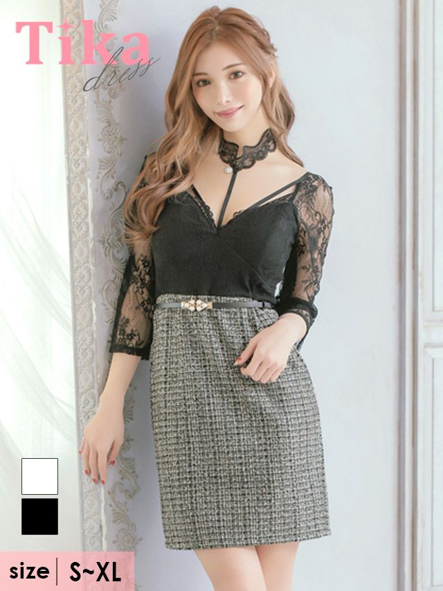 ツイードスカート袖ありチョーカーネックベルト付きタイトミニドレス (Sサイズ~XLサイズ) (ゆんころ/キャバドレス着用)