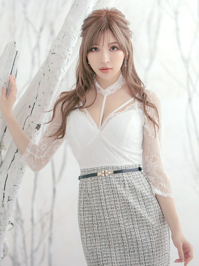 3. ツイードスカート袖ありチョーカーネックベルト付きタイトミニドレス (Sサイズ~XLサイズ) (ゆんころ/キャバドレス着用)