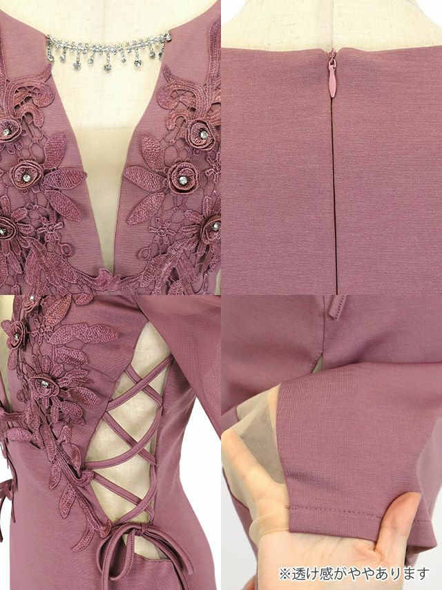 タイトミニドレス長袖谷間大きいサイズフラワー刺繍ヌーディーシアーくびれ透けレースアップストレッチのサイドバック