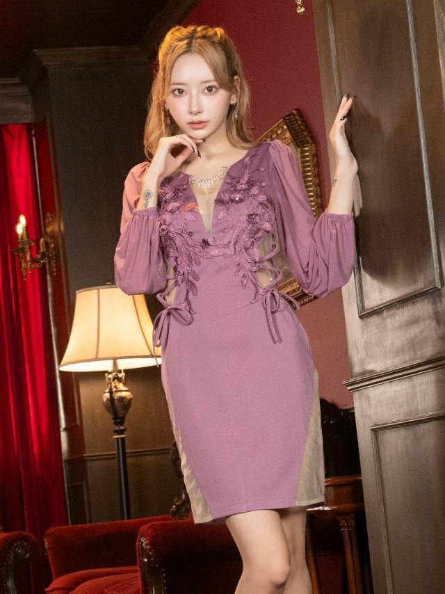 5. タイト ミニドレス 長袖 谷間 大きいサイズ ストレッチ フラワー刺繍 くびれ レースアップ ヌーディーシアー切替 バストシースルー (横田未来着用) [Tika/ティカ]