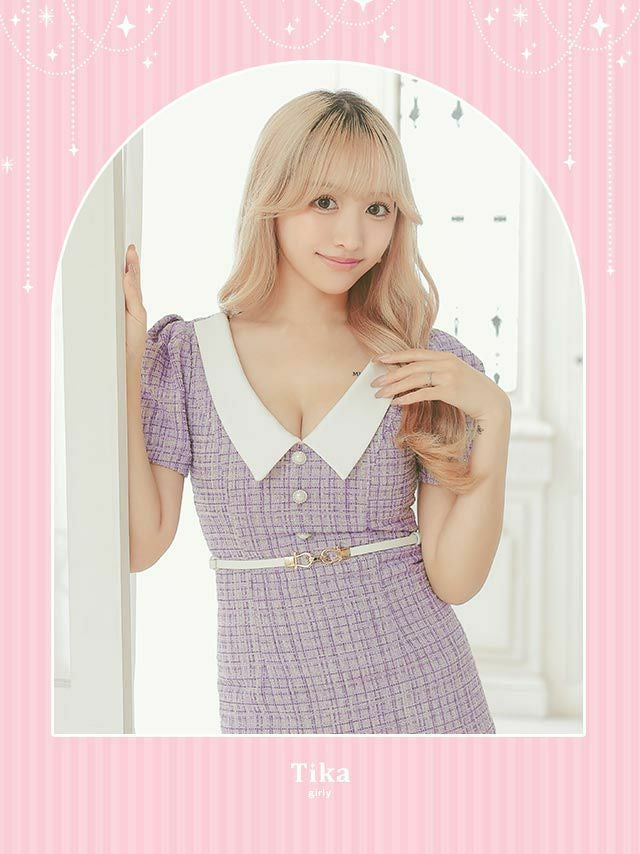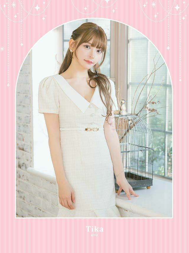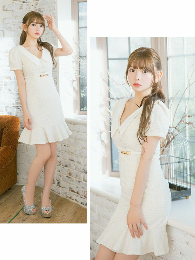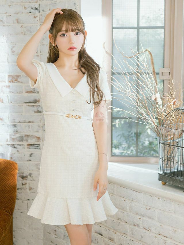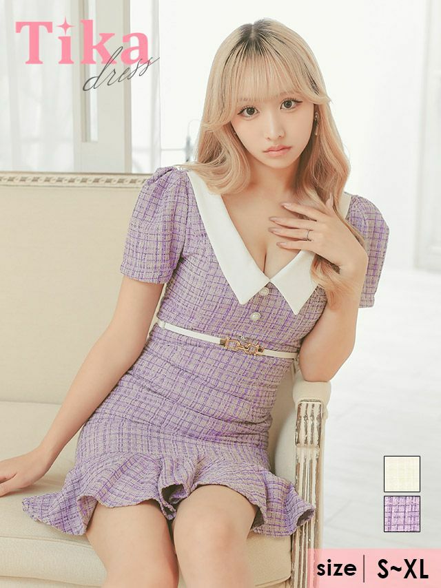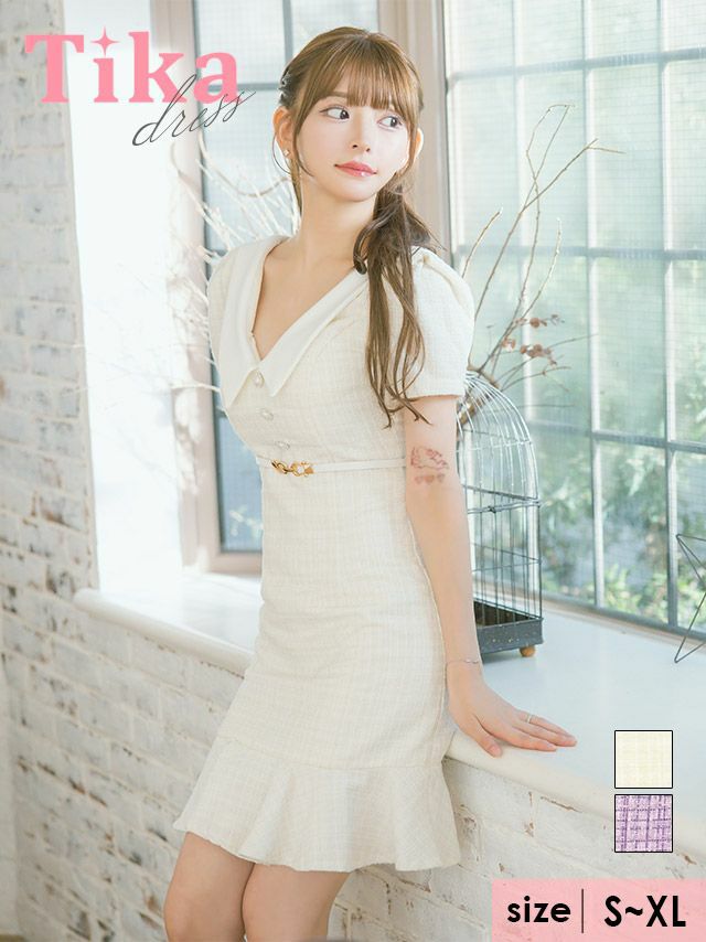 3. [アウトレット] ベルト付き チェルシーカラー 半袖 パフスリーブ ツイード 裾フリル 襟付き タイトミニドレス (Sサイズ~XLサイズ) (重川茉弥/キャバドレス着用) [Tika/ティカ]