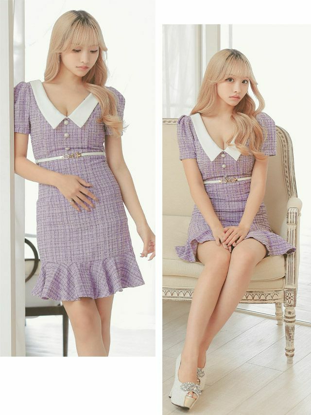 5. [アウトレット] ベルト付き チェルシーカラー 半袖 パフスリーブ ツイード 裾フリル 襟付き タイトミニドレス (Sサイズ~XLサイズ) (重川茉弥/キャバドレス着用) [Tika/ティカ]