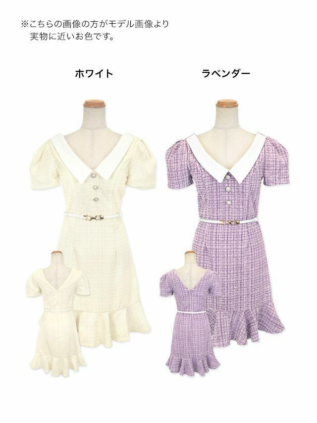 ベルト付き チェルシーカラー 半袖 パフスリーブ ツイード 裾フリル 襟付き タイトミニドレスのカラー