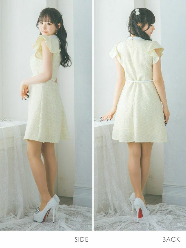5. ウエストベルト付き フラワーモチーフ ビジュー襟 フリル袖 ツイード 半袖 フレアミニドレス (Sサイズ~XLサイズ) (重川茉弥/キャバドレス着用) [Tika/ティカ]