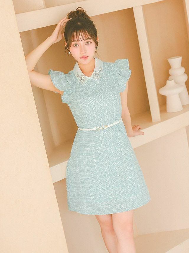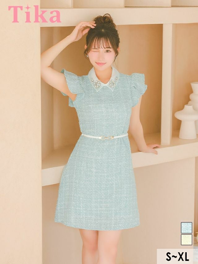 ガーリーなデザインがキュート♡ ウエストベルト付き フラワーモチーフ ビジュー襟 フリル袖 ツイード 半袖 フレアミニドレス (Sサイズ~XLサイズ) (重川茉弥/キャバドレス着用) [Tika/ティカ]