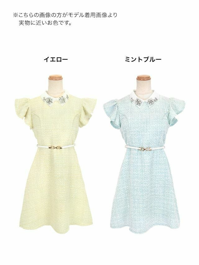 ウエストベルト付きフラワーモチーフビジュー襟フリル袖ツイード半袖フレアミニドレス