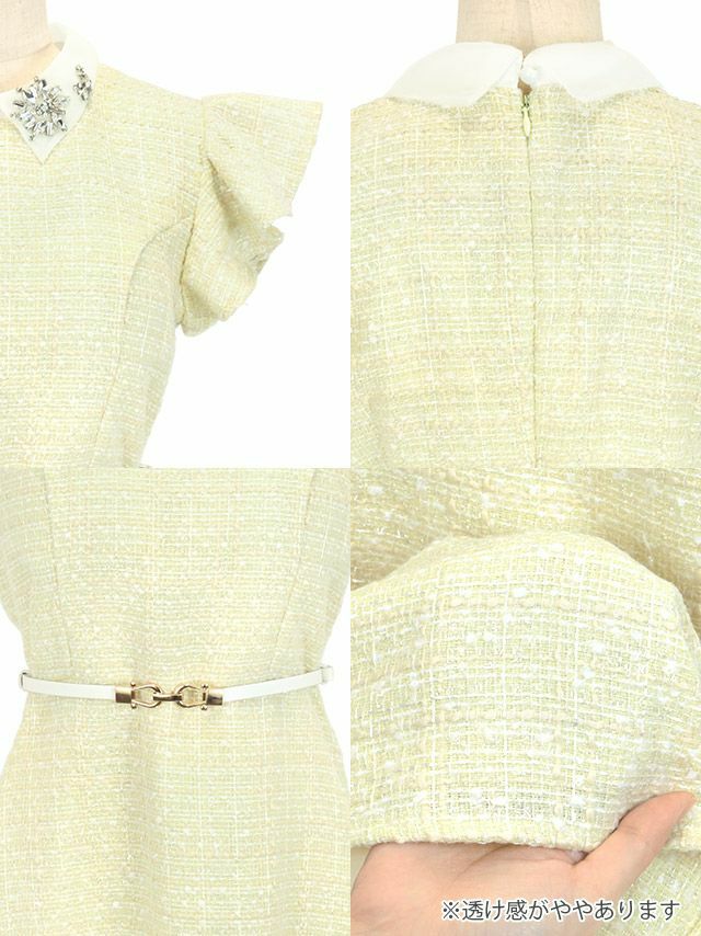 4. ウエストベルト付き フラワーモチーフ ビジュー襟 フリル袖 ツイード 半袖 フレアミニドレス (Sサイズ~XLサイズ) (重川茉弥/キャバドレス着用) [Tika/ティカ]
