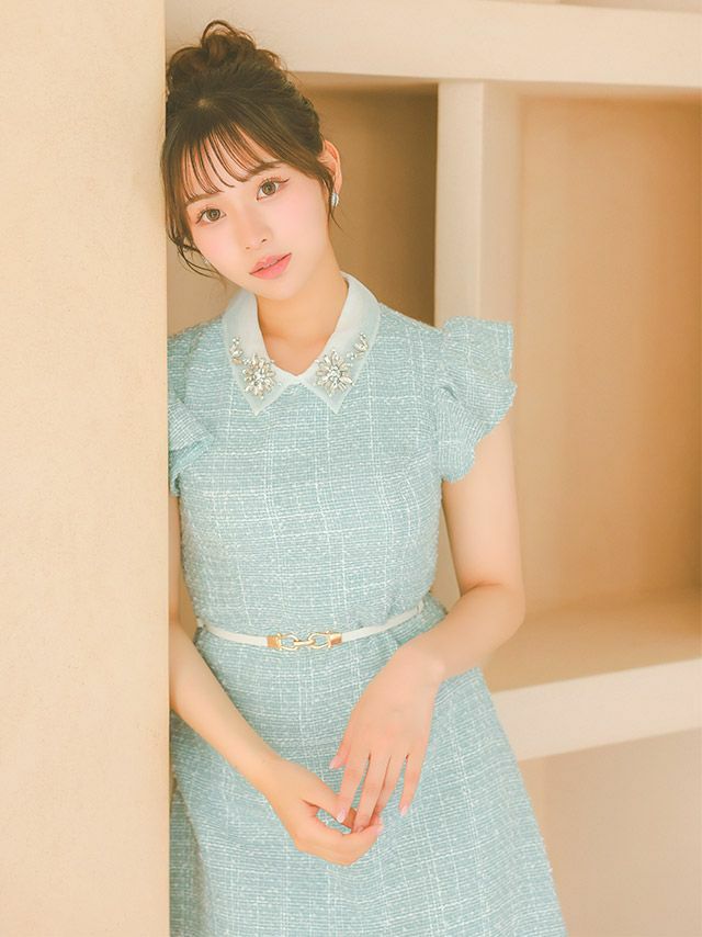 キャバドレス ミニ丈 キャバクラ クラブ ラウンジ 襟付き フラワービジュー フリル袖 ウエストベルト 半袖 ツイード フレアミニドレス