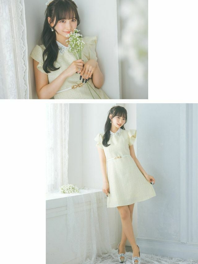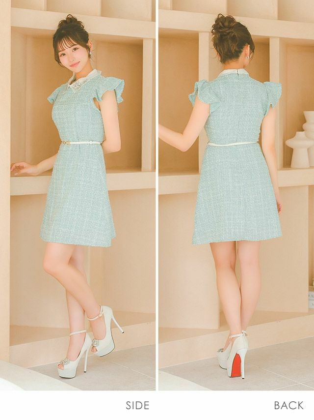 3. 襟付き フラワービジュー フリル袖 ウエストベルト 半袖 ツイード フレアミニドレス (Sサイズ~XLサイズ) (上ノ堀結愛/キャバドレス着用) [Tika/ティカ]