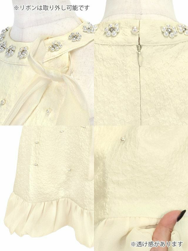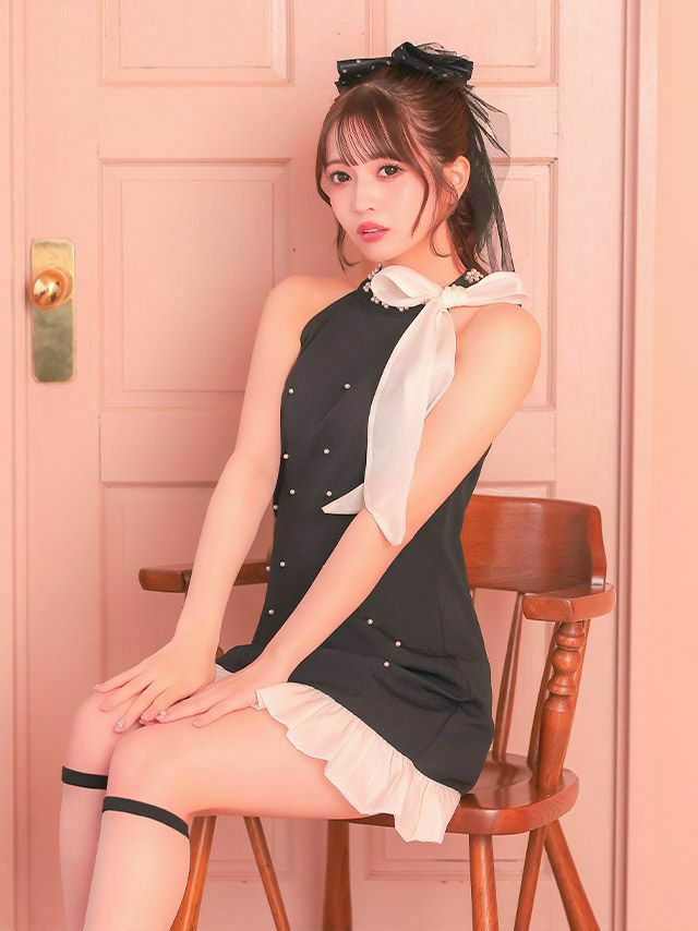 5. [新作] ワンピース Aライン ミニドレス ノースリーブ 上品 ハイネック ネックリボン シフォン フラワーストーン パール 裾フリル (若林萌々着用) [Tika/ティカ]