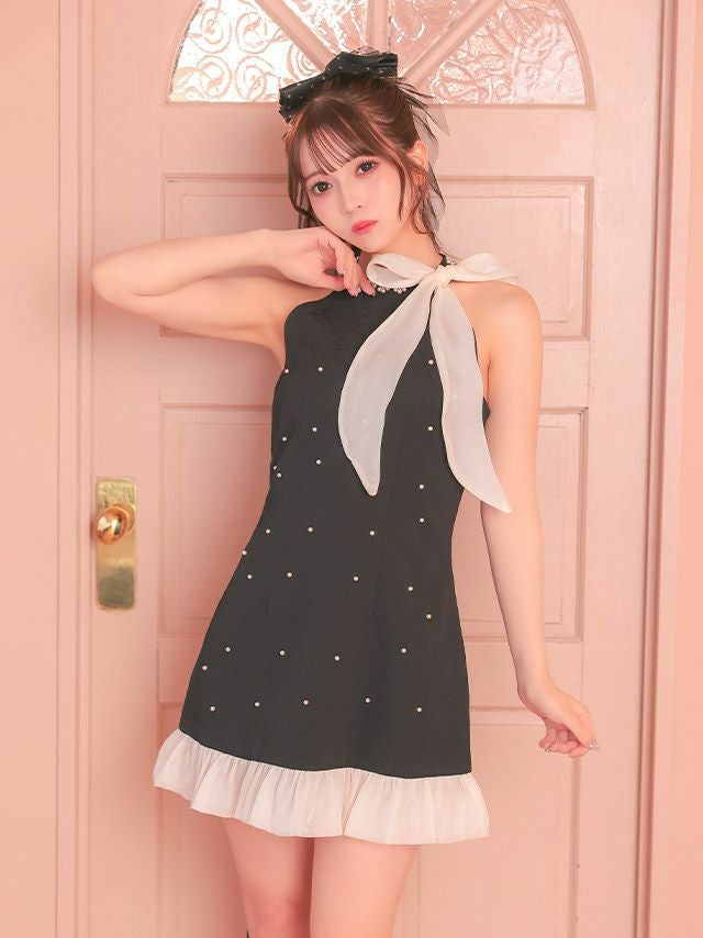 程よい肌見せ&優雅で愛らしい欲張りディティール♡ [新作] ワンピース Aライン ミニドレス ノースリーブ 上品 ハイネック ネックリボン シフォン フラワーストーン パール 裾フリル (若林萌々着用) [Tika/ティカ]