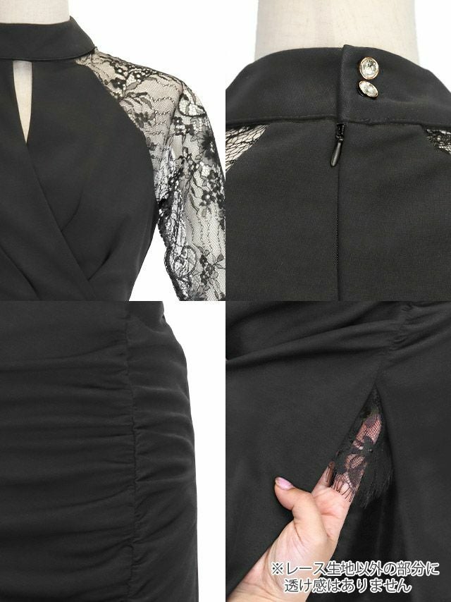 タイト膝丈ドレス袖あり谷間大きいサイズシンプルレース大人スリット上品ハイネックストレッチ七分袖のディティール1枚目