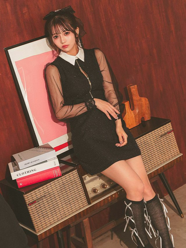 3. ワンピース Aライン ミニドレス 長袖 谷間 ジップ 大人 上品 ハイネック ツイード 襟付き シアースリーブ ブラジャーのまま 同伴 (黒嵜菜々子着用) [Tika/ティカ]
