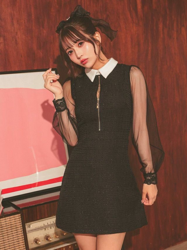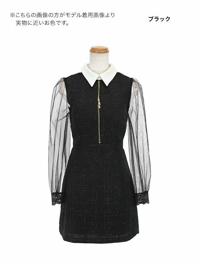 お嬢様チックなモテワンピ♡ ワンピース Aライン ミニドレス 長袖 谷間 ジップ 大人 上品 ハイネック ツイード 襟付き シアースリーブ ブラジャーのまま 同伴 (黒嵜菜々子着用) [Tika/ティカ]