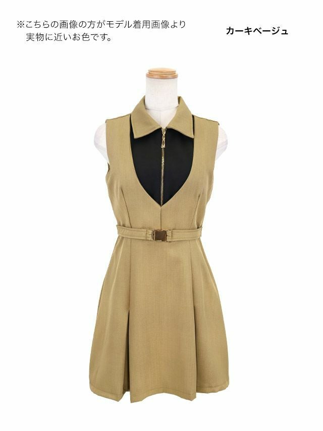 3. [新作] ミニドレス Aライン ノースリーブ ワンピース 同伴 ジップ 谷間 襟付き バイカラー ベルト付き ブラジャーのまま 大きいサイズ XL XXL カーキ ベージュ キャバドレス (若林萌々着用) [tk-mdij2213] [Tika/ティカ]