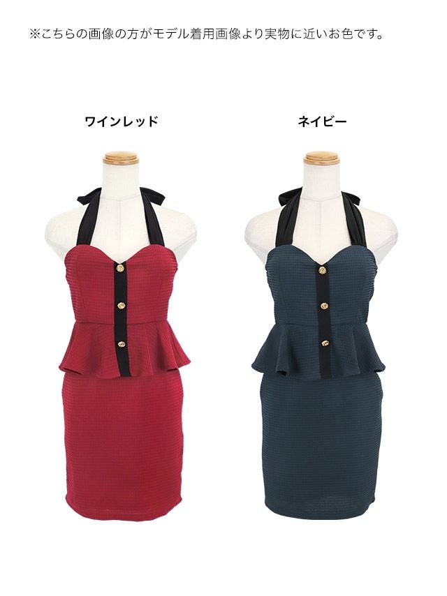 タイトミニドレス谷間ストレッチペプラムホルターネックリボンワッフルバイカラーキャバドレス