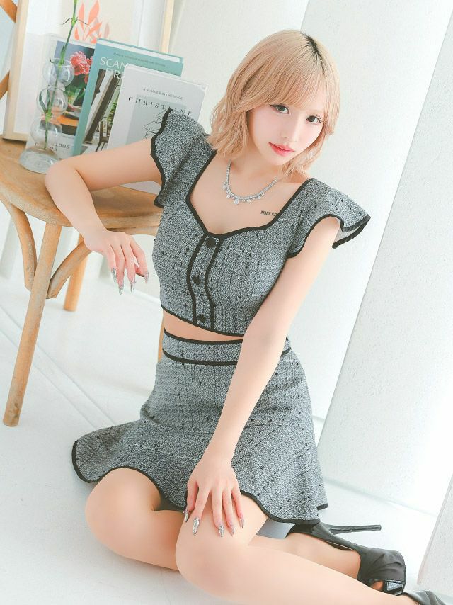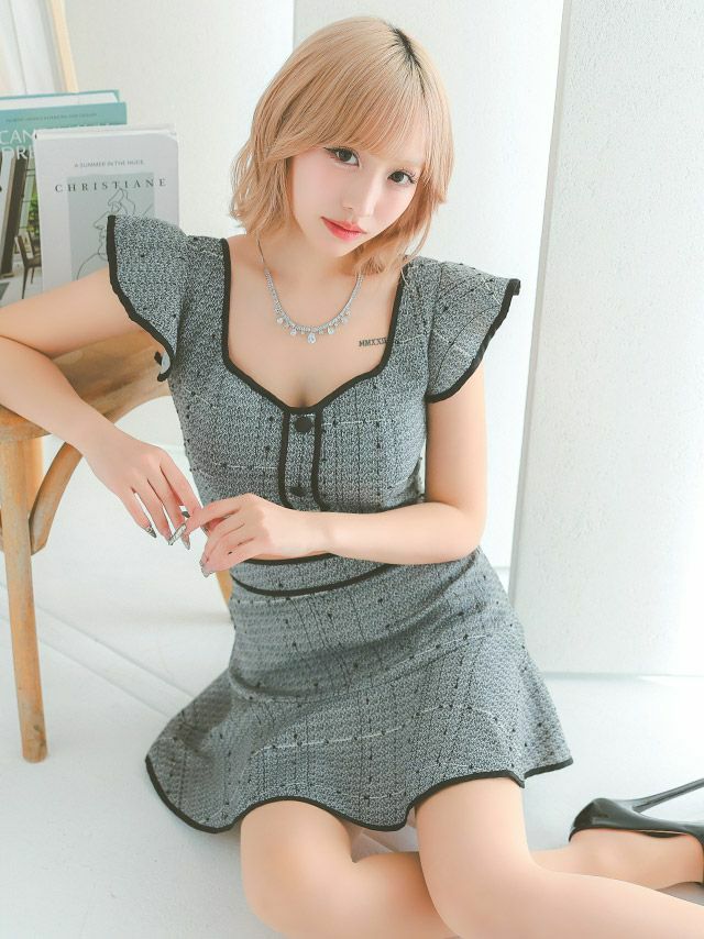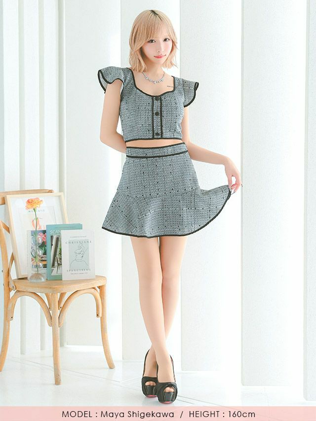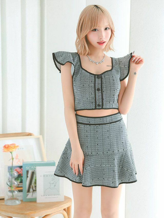 キャバドレス ミニ丈 キャバクラ クラブ ラウンジ ノースリーブ フリル袖 ツイード パイピング セットアップ フレアミニドレス