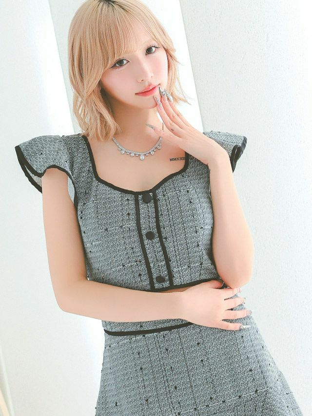 3. [アウトレット] ノースリーブ フリル袖 ツイード パイピング セットアップ フレアミニドレス (Sサイズ~Lサイズ) (重川茉弥/キャバドレス着用) [Tika/ティカ]