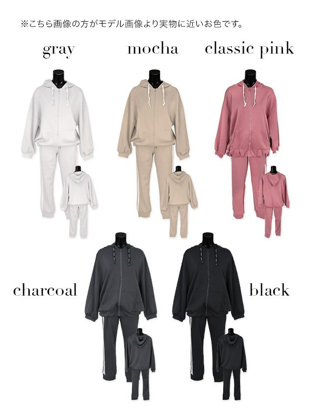 ルームウェア 柔らかダンボールニットファスナーパーカーラインパンツ上下セット (ブラック/チャコール/グレー/クラシックピンク/モカ)