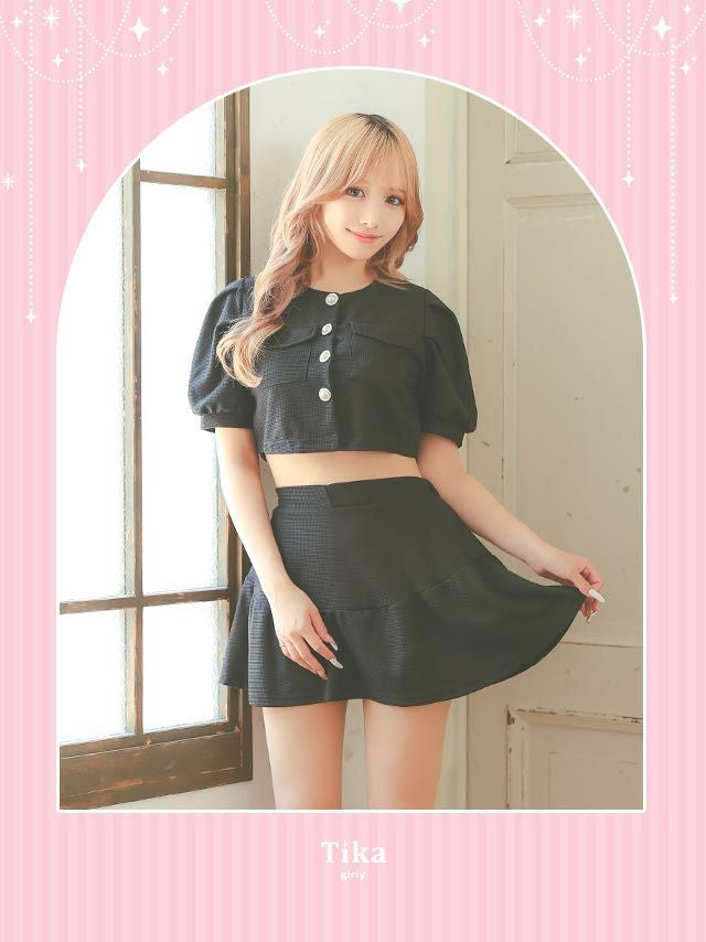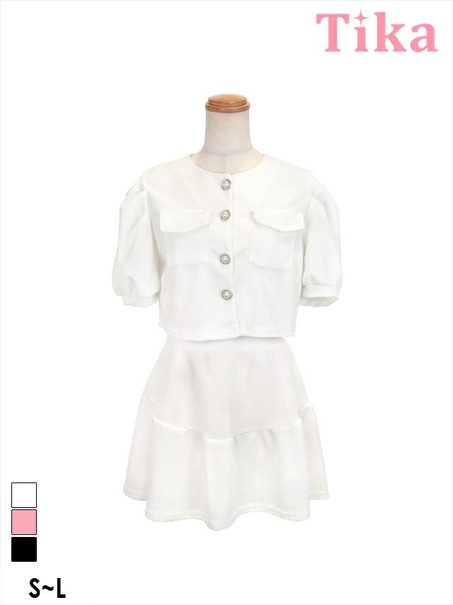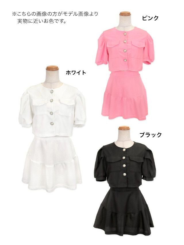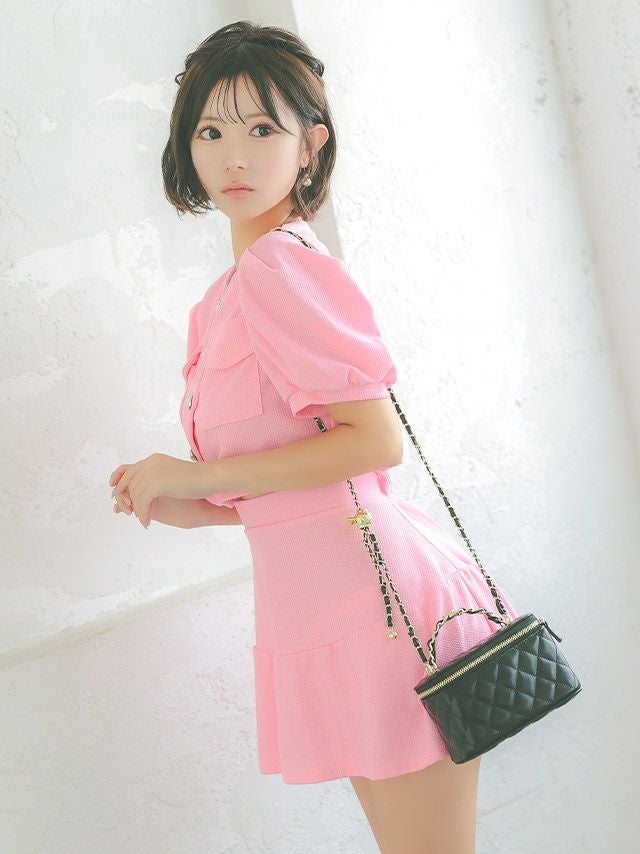 半袖パフスリーブボタンセットアップフレアミニドレス
