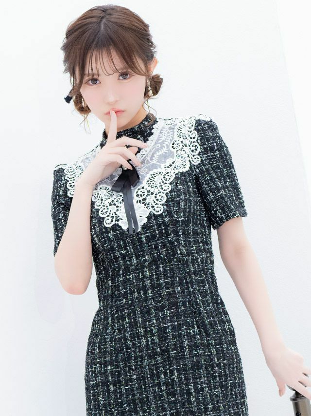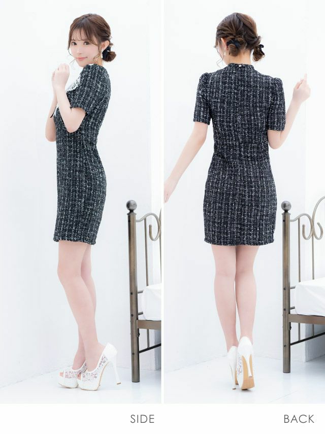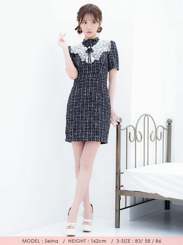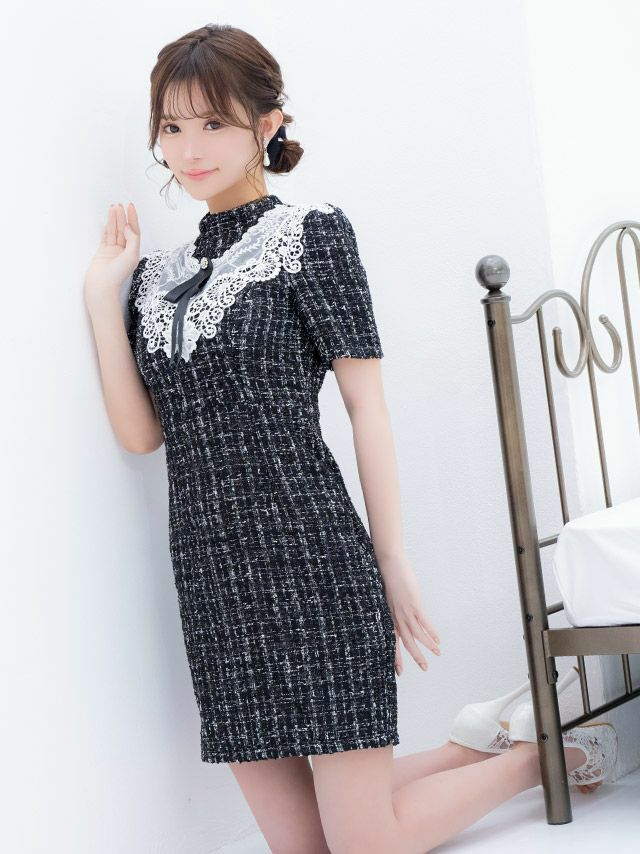 5. [アウトレット]ネックリボン フラワーレース 半袖 ツイード チェック柄 タイトミニドレス (Sサイズ~XXLサイズ) (聖菜/キャバドレス着用) [Tika/ティカ]