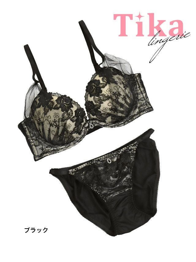 チュール×フラワー刺繍脇高カップブラジャー&ショーツ2点セットの1枚目