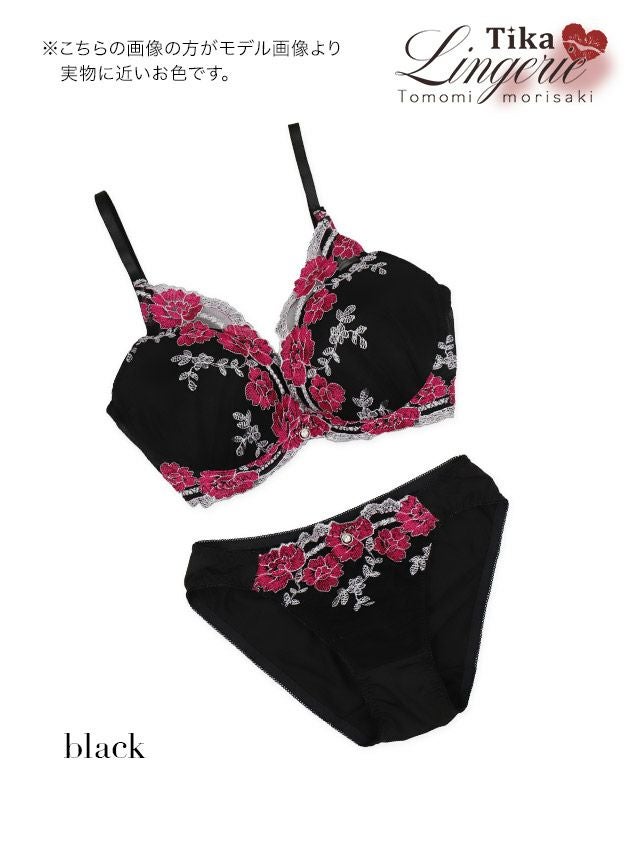 チャーム付きビビットフラワー刺繍シアーブラジャー&ショーツ2点セットの1枚目