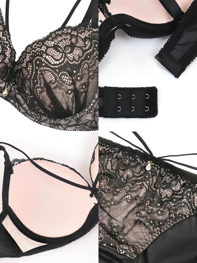 ヌーディーブラックレースマカロニコードカップブラジャー&ショーツ2点セット