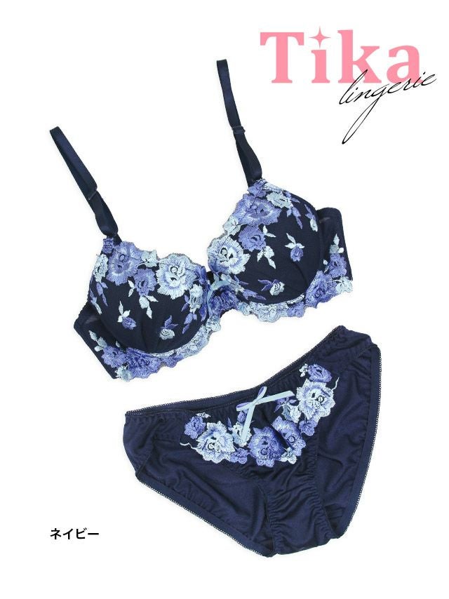 ブルー系ローズ刺繍リボンカップブラジャー&ショーツ2点セット