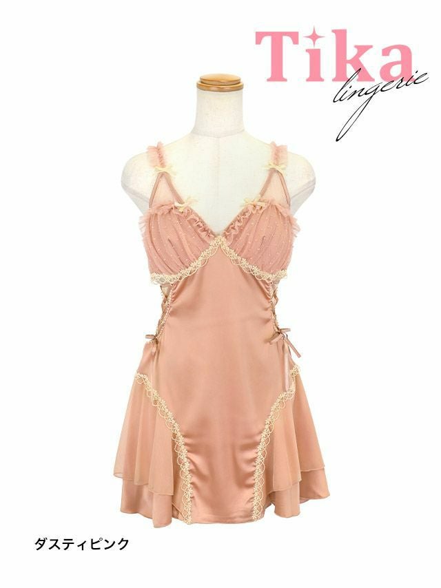 ドットチュールフリルサイド編み上げリボンベビードール1