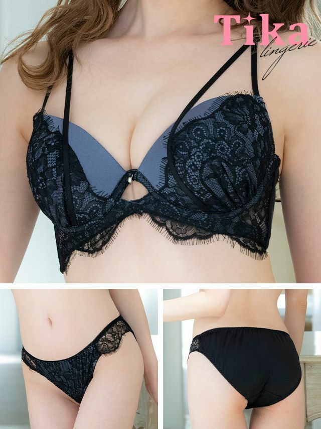 ランジェリー下着アイラッシュレースカットアウト脇高ワイヤーブルーブラジャーショーツ2点セット1
