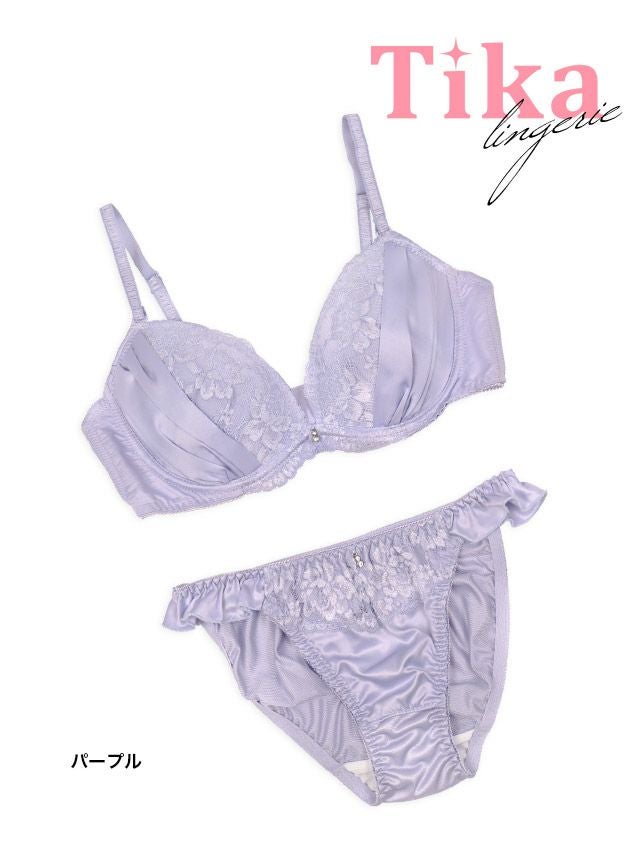 フラワーレースサイドサテンブラ&フリルショーツ2点セット