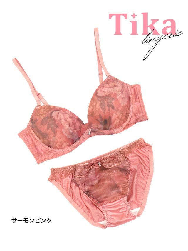 3. 勝負下着 ビジューチャームニュアンス花柄脇高フルカップブラジャー&ショーツ2点セット