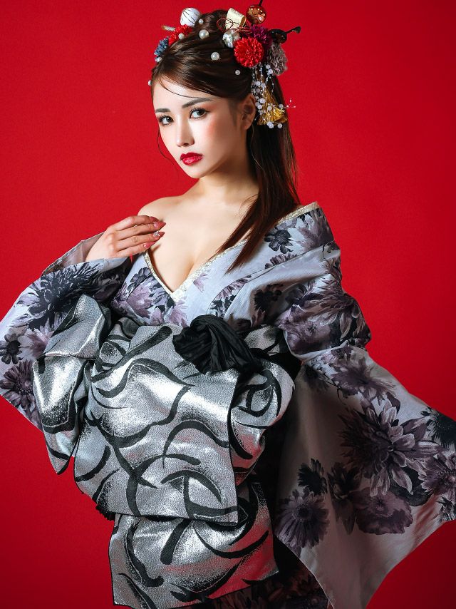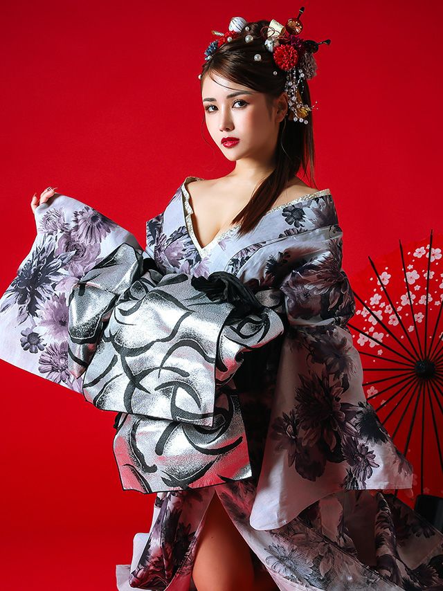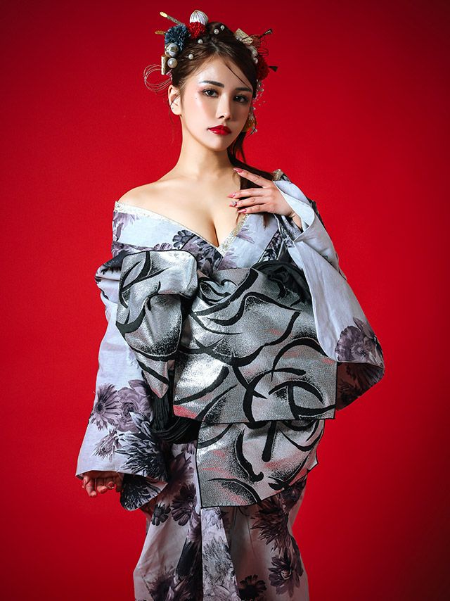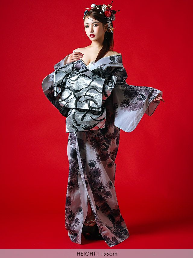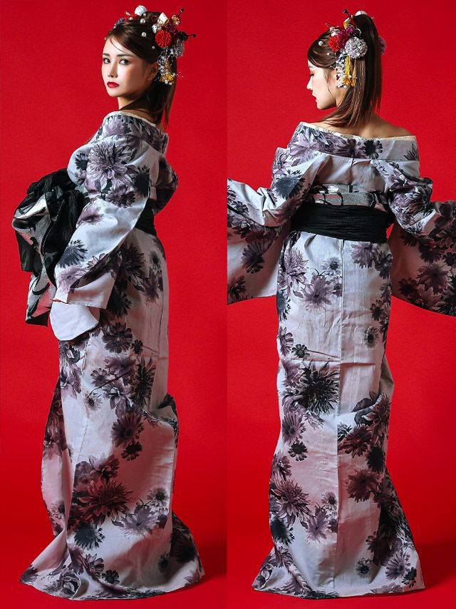 シックで華やかな1着☆ 花魁浴衣 2way グレー地 ヴィンテージフラワー 5点セット (ゆかた・下駄・兵児帯・飾り兵児帯・肌襦袢)