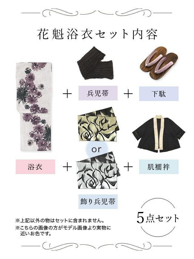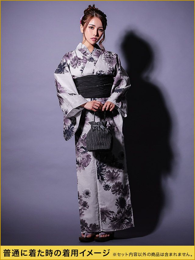 花魁浴衣 2way グレー地 ヴィンテージフラワー 5点セット
