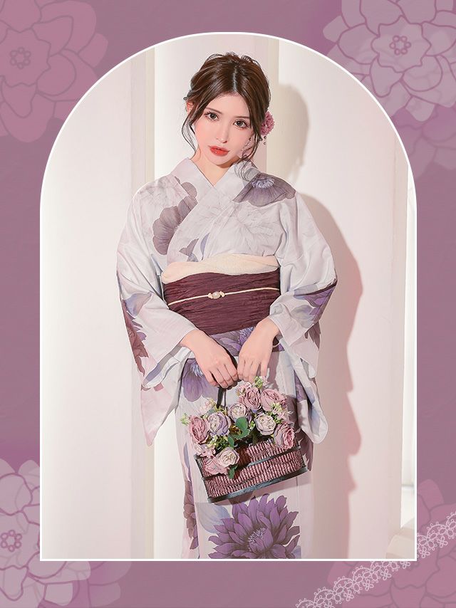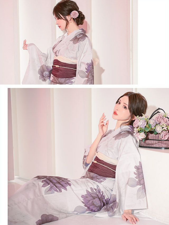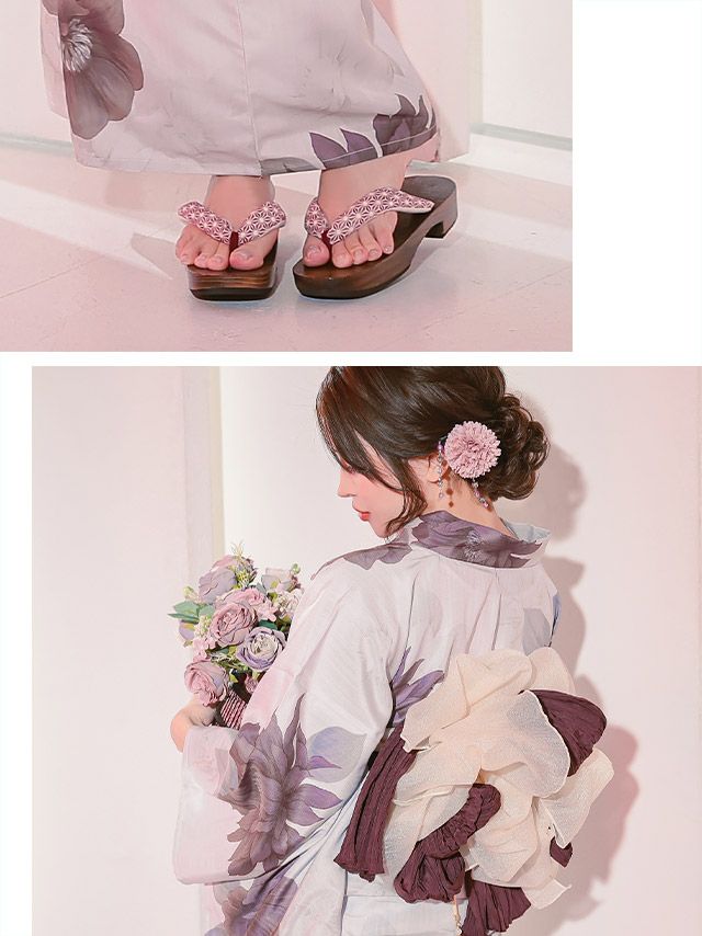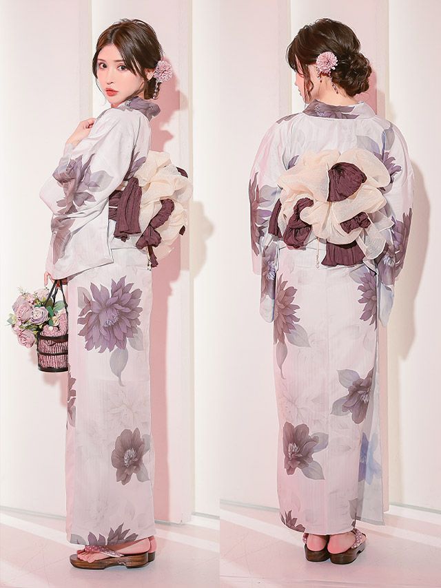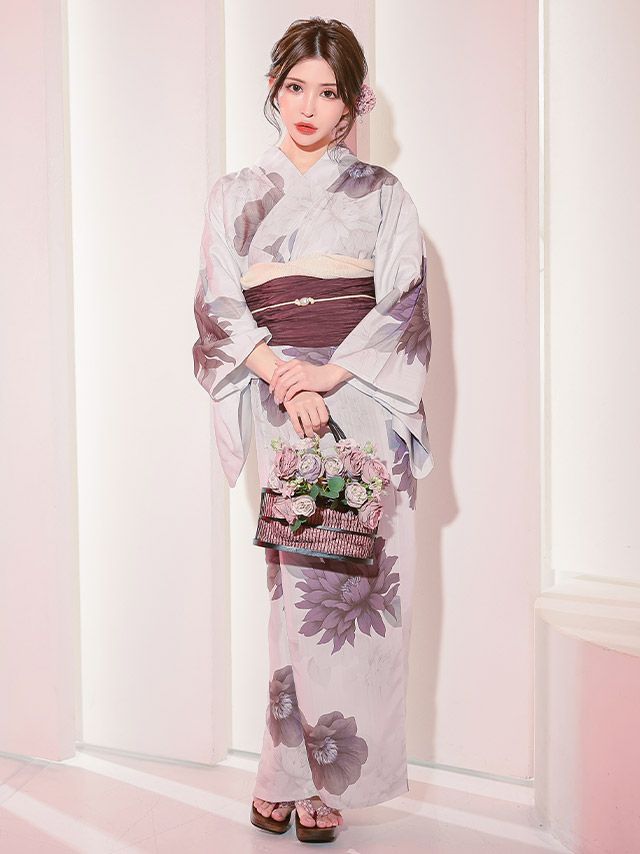 4. 浴衣 妖艶 白地×くすみパープル大輪牡丹 ゆかた3点セット (浴衣+兵児帯+下駄)