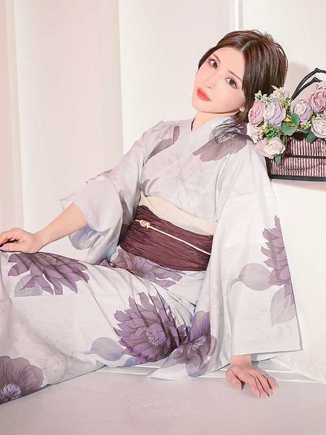 5. 浴衣 妖艶 白地×くすみパープル大輪牡丹 ゆかた3点セット (浴衣+兵児帯+下駄)