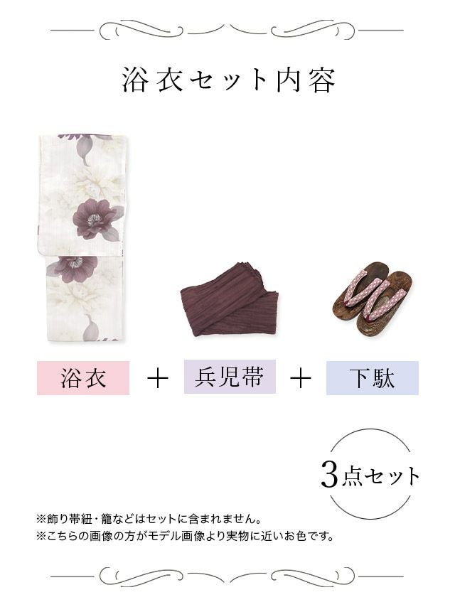 浴衣 妖艶 白地×くすみパープル大輪牡丹 ゆかた3点セット (浴衣+兵児帯+下駄)