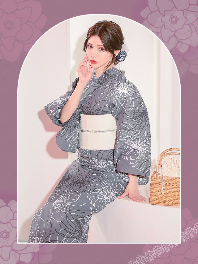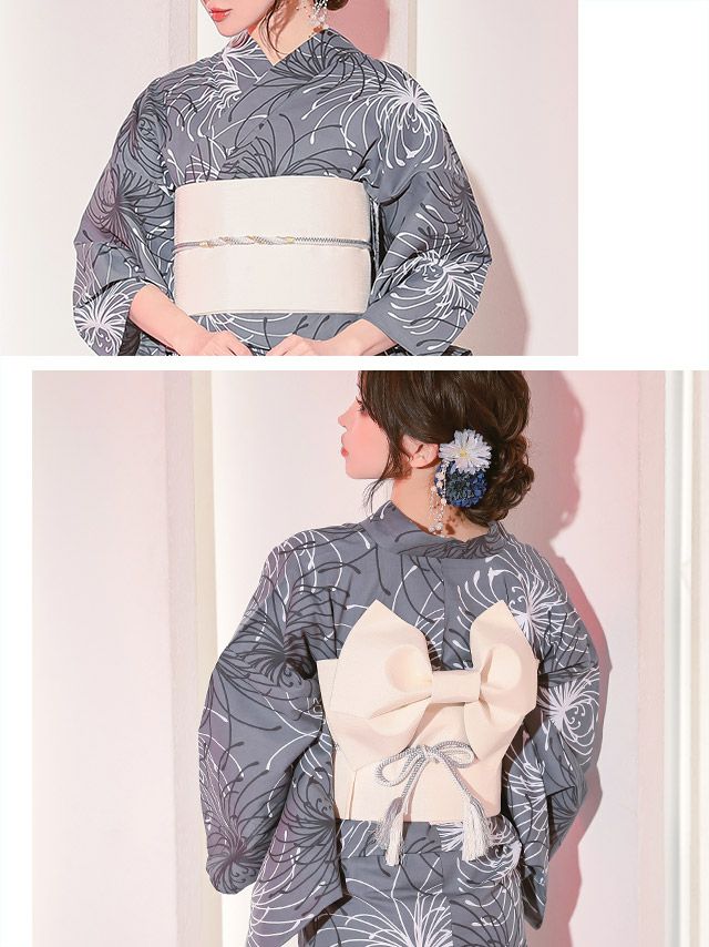 4. 浴衣 妖艶 グレーモダン×白黒糸菊 ゆかた2点セット (浴衣+作り帯)