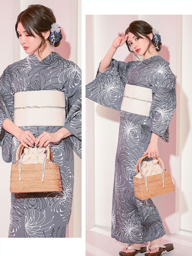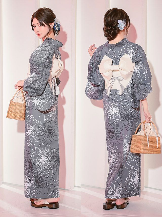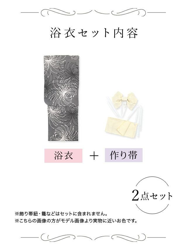 浴衣 妖艶 グレーモダン×白黒糸菊 ゆかた2点セット (浴衣+作り帯)