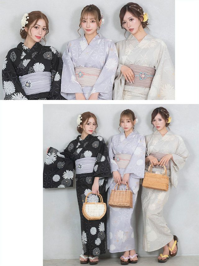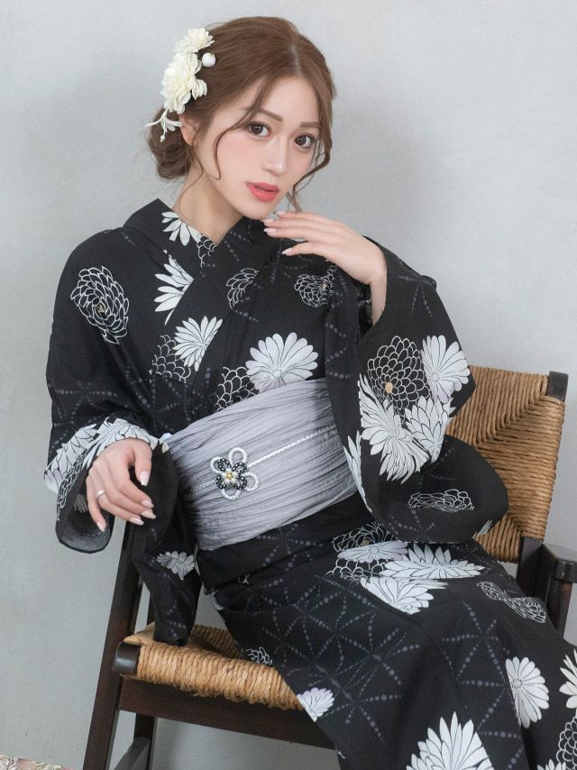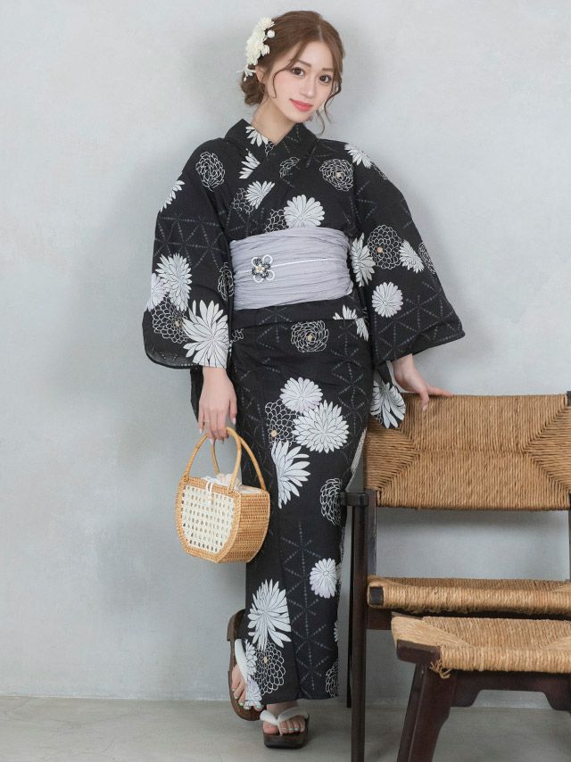 4. 浴衣 レトロ 菊柄×モノトーン黒地 ゆかた3点セット (浴衣+兵児帯+下駄) (なぎ着用)