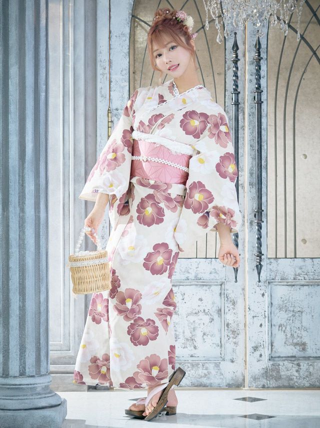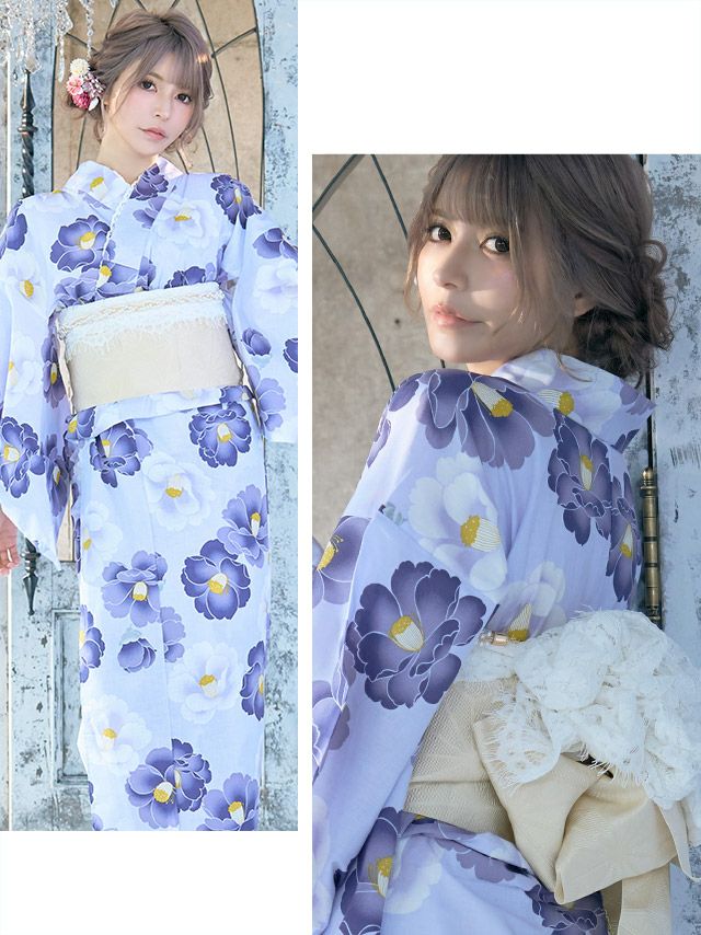 4. 浴衣 選べる帯 SWEET ニュアンスカラー×グラデーション椿 ゆかた3点セット (浴衣+平帯or作り帯+下駄) (黒崎みさ/めぐりっぷ/五十嵐美咲着用)
