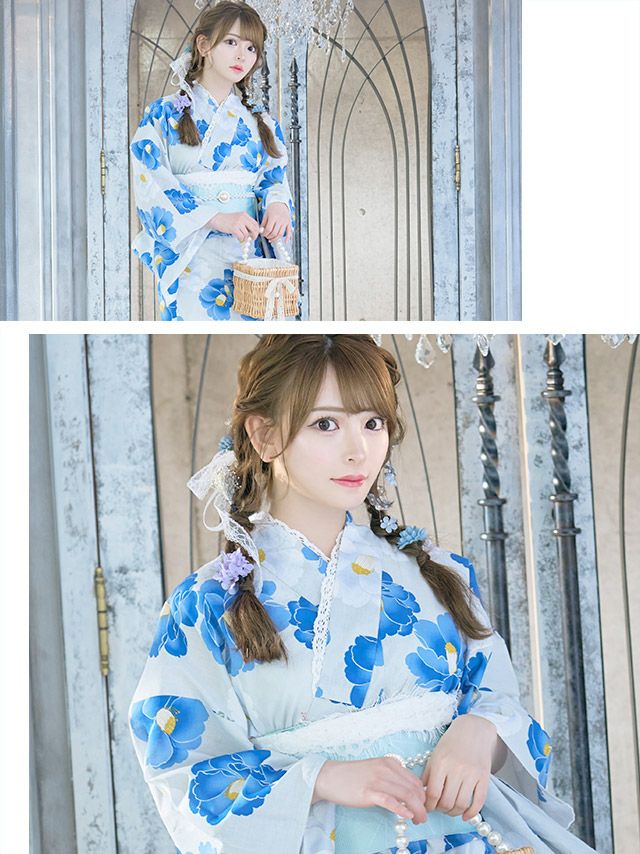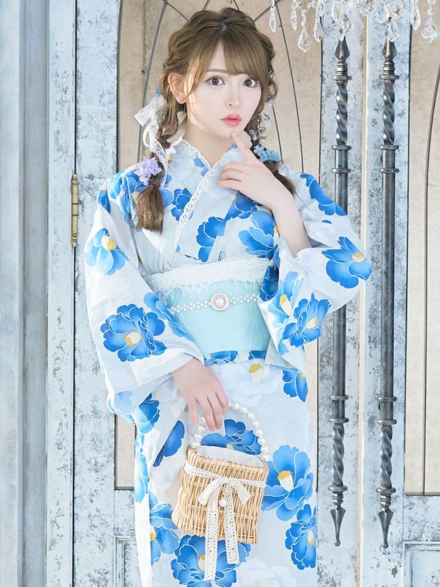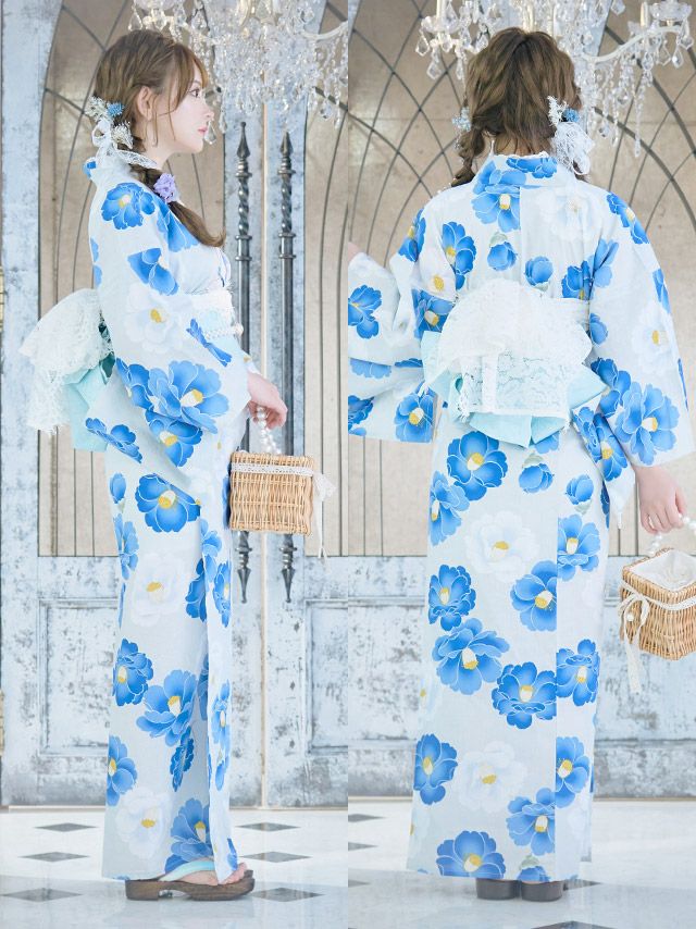 スウィート ニュアンスカラー×グラデーション椿 ゆかた3点セットのブルーの全身フロント画像