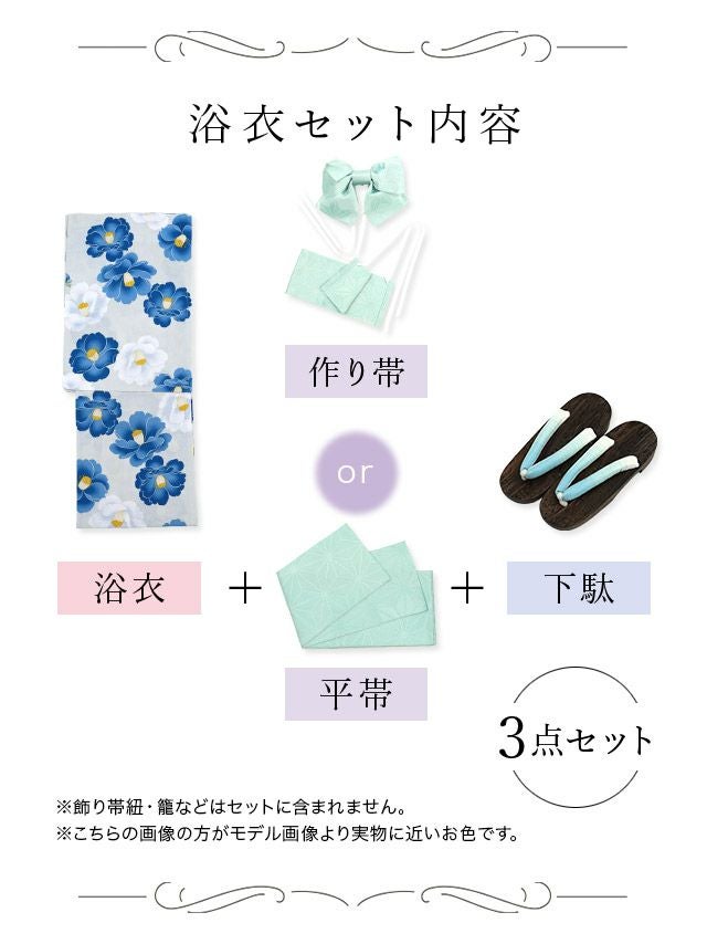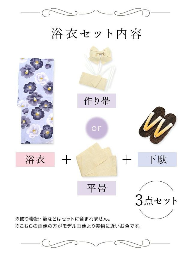 ピンク スウィート ニュアンスフラワーゆかたベージュの3点セット内容 ブルー スウィート ニュアンスフラワーゆかたライトブルーの3点セット内容 パープル スウィート ニュアンスフラワーゆかたグレーの3点セット内容