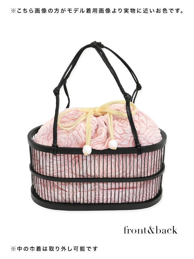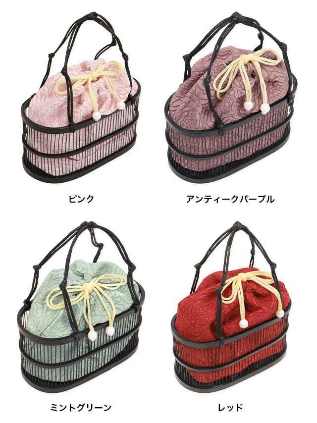 浴衣 小物 竹かごバッグフラワー刺繍巾着付き(ピンク/アンティークパープル/レッド/ミントグリーン)