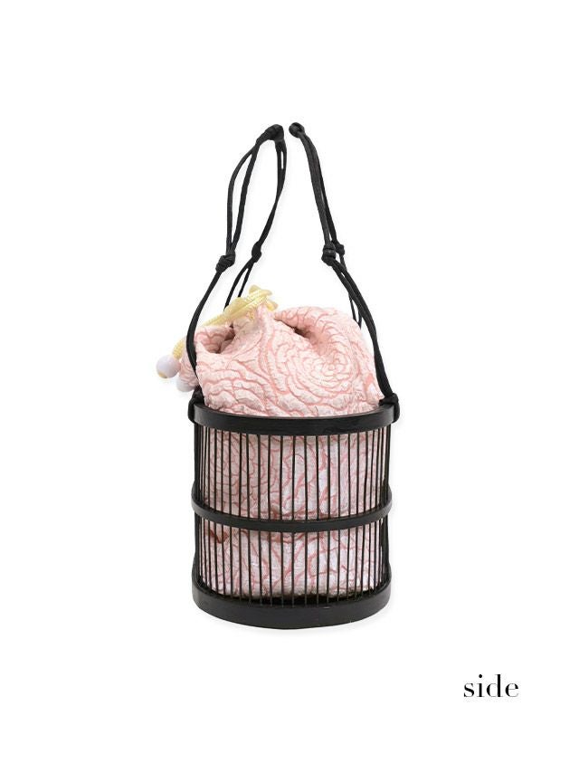 小物 竹かごバッグフラワー刺繍巾着付き